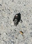 Tässä on kyllä saanut katsella lähettämääsi kuvaa tarkkaan. Todennäköisesti siinä kipittää poispäin vastakuoriutunut lasisiipisten heimoon (Sesiidae) kuuluva perhonen, jonka siivetkään eivät ole vielä avautuneet mittaansa tai ovat jopa jääneet pysyvästi epämuodostuneiksi. Lasisiipinen muistuttaa äkkikatsomalta enemmän ampiaista kuin perhosta. Niitä on Suomessa 17 eri lajia. Vattulasisiiven toukat elävät vadelmien varsien sisällä tuhoten kasvin vartta ja juuristoa. Se sopisi värityksensä perusteella kuvasi hyönteiseen. Toisaalta taas suurempi ja tanakampi haavanlasisiipi sopisi muuten, mutta sen takaruumiin raidat ovat keltaiset, kun taas vattulasisiivellä ne ovat valkoiset, kuten kuvassasi. Haavanlasisiiven toukat elävät suurten ja lahjojen, vanhojen haapojen rungoissa. Et ole maininnut kuvaamasi hyönteisen kokoa, joten sen vuoksi täytyy nyt vähän siis arvailla. Lasisiipiset ovat kauniita, erikoisia perhosia, joita aika harvoin onnistuu näkemään, vaikka suuri osa niistä onkin yleisiä. Kiva havainto siis.